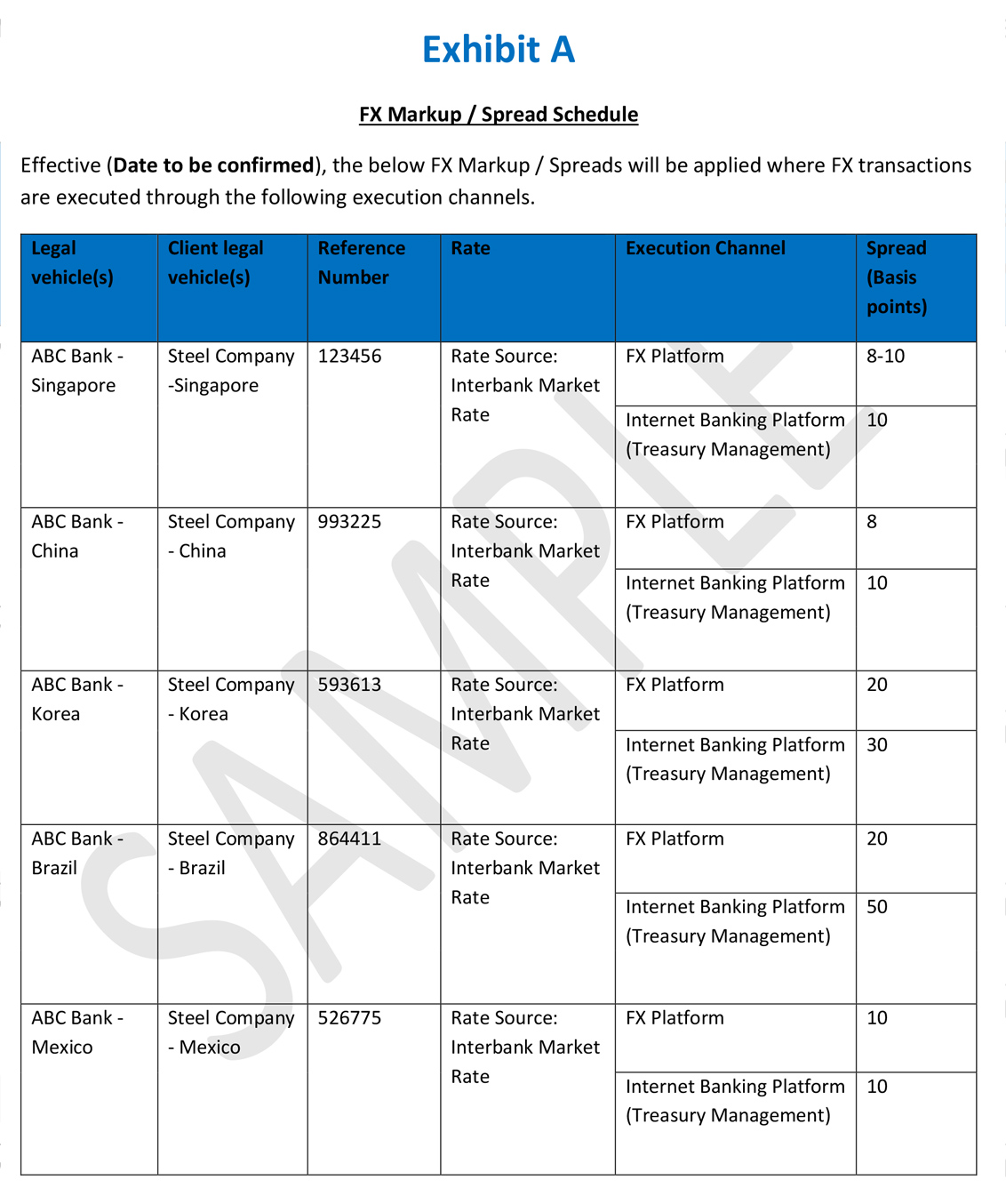 In this sample, Company B has entered into a new Pre-Agreed Spread Arrangement with Bank B. Similar to Bank A, Bank B does not act in a fiduciary capacity, but it reserves the right to deviate from the agreed spread based on a wide range of operational and market factors, including transaction costs, execution channels, client credit risk, and the overall client relationship. Bank B’s spread schedule is more detailed than Bank A’s, featuring an 8-basis point markup that varies depending on transaction type.